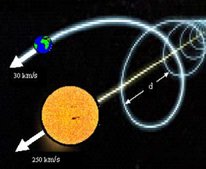 Брзина кретања Сунчевог система око центра галаксије је 250 километара у секунди, а брзина револуције Земље око Сунца је 30 километара у секунди. Земља се око Сунца креће се у облику завојнице, чији је полупречник r = mvsinӨ/qB. Пут који пређе Земља у току једне календарске године у односу на центар галаксије је d = 2πrmvcosӨ/qB, где је B вектор магнетске индукције, a q електрично оптерећење; Ө угао између вектора брзине v и вектора магнетске индукције B.